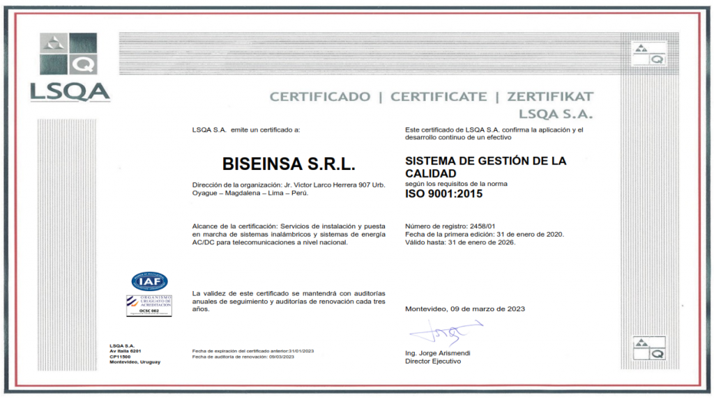 BISEINSA, enfocado a la mejora contínua en la prestación de sus servicios ha logrado la Certificación de Calidad ISO 9001:2015.